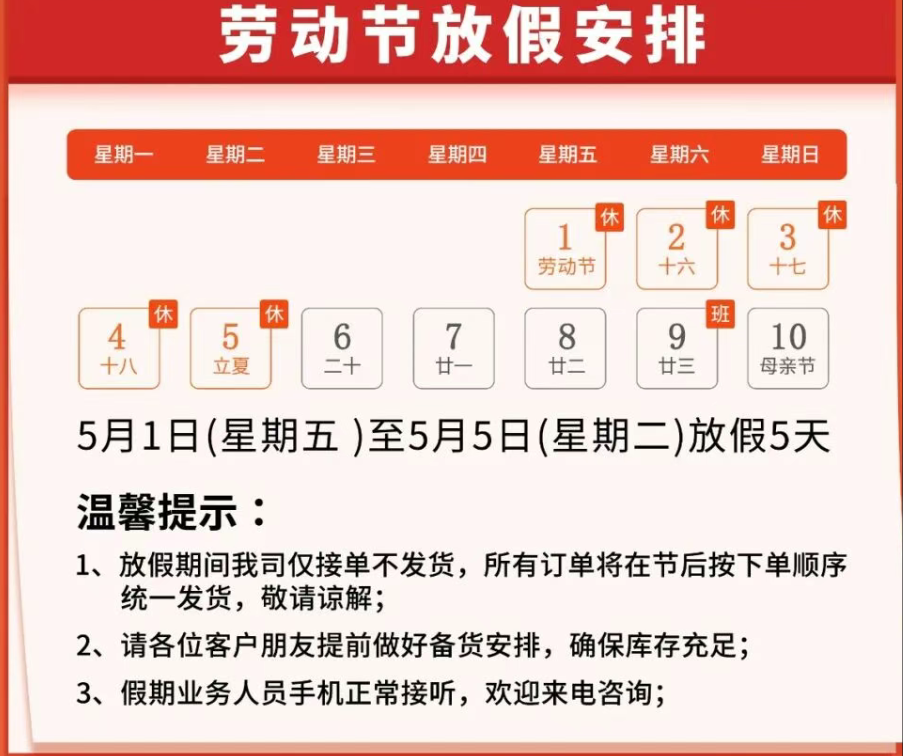 物流安排: 5月1日至5月5日放假期间,公司仅接受订单,暂停货物发送。所有在假期产生的订单,将在5月6日开工后,严格按照客户下单的先后顺序统一组织发货。